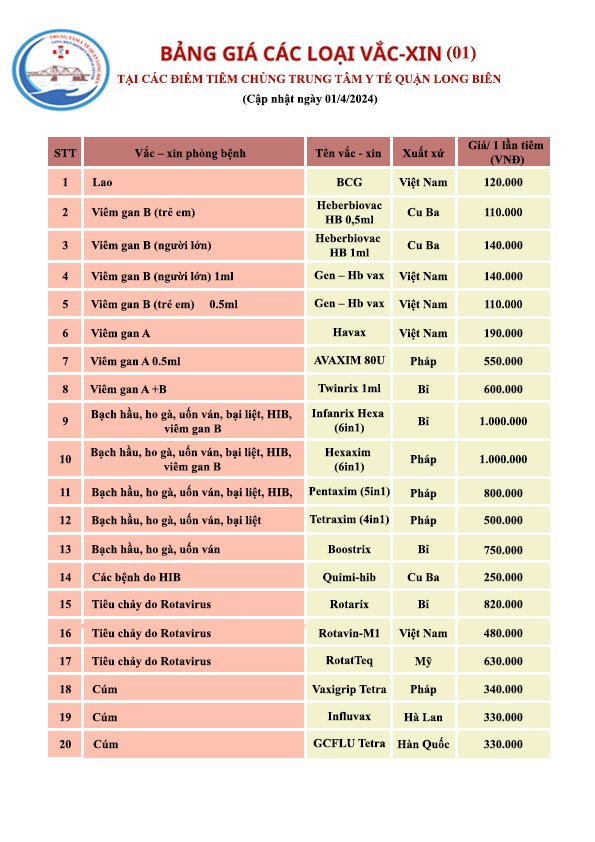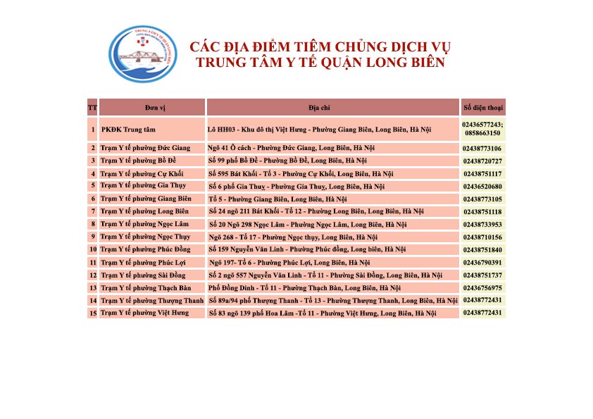 ĐỊA ĐIỂM TIÊM VÀ GIÁ TIÊM VẮC XIN DỊCH VỤ TẠI TRUNG TÂM Y TẾ QUẬN LONG BIÊN TỪ NGÀY 01/4/2024