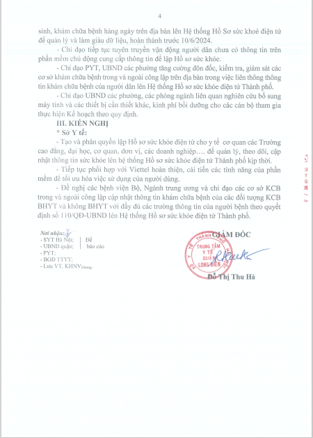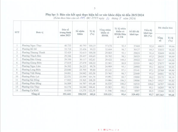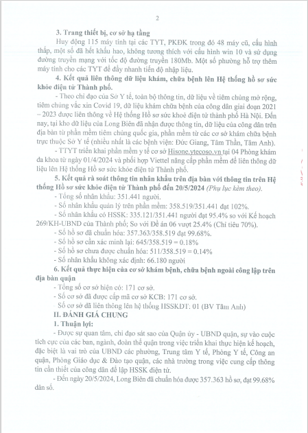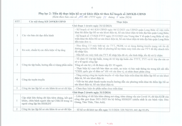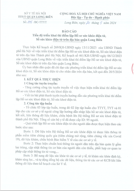 BÁO CÁO TIẾN ĐỘ TRIỂN KHAI THÍ ĐIỂM LẬP HỒ SƠ SỨC KHOẺ ĐIỆN TỬ, SỔ SỨC KHOẺ ĐIỆN TỬ TRÊN ĐỊA BÀN QUẬN LONG BIÊN
