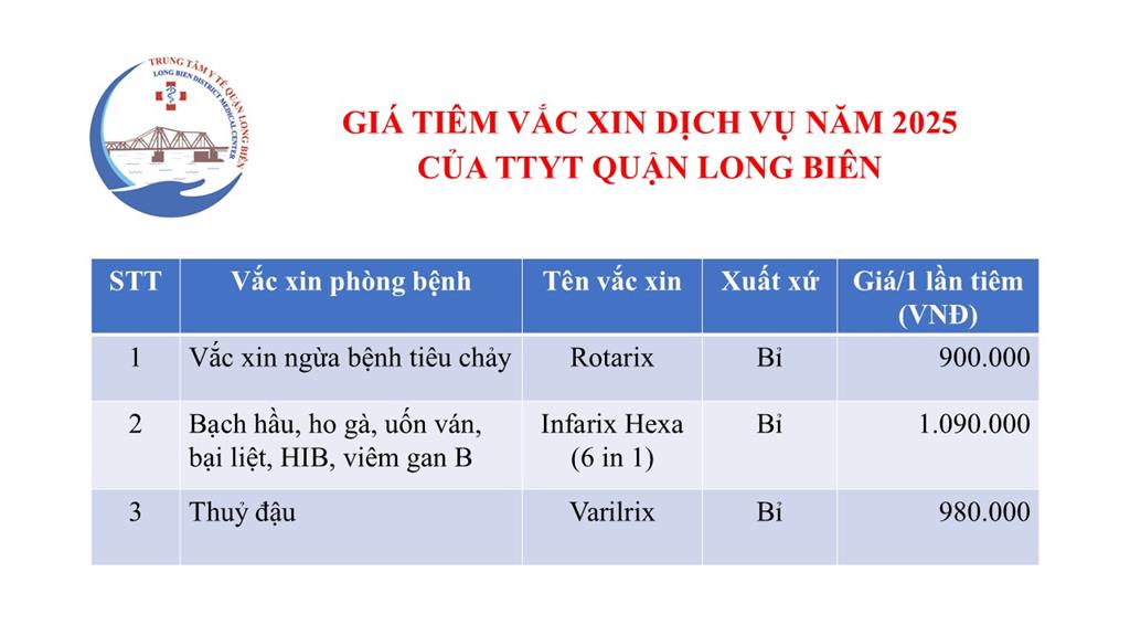 THÔNG BÁO GIÁ TIÊM MỘT SỐ LOẠI VẮC XIN DỊCH VỤ NĂM 2025 CỦA TTYT QUẬN LONG BIÊN.