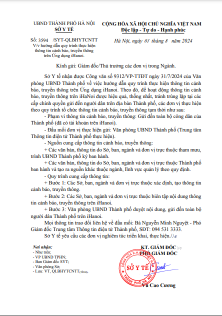 VỀ VIỆC HƯỚNG DẪN QUY TRÌNH THỰC HIỆN THÔNG TIN CẢNH BÁO, TRUYỀN THÔNG TRÊN ỨNG DỤNG IHANOI